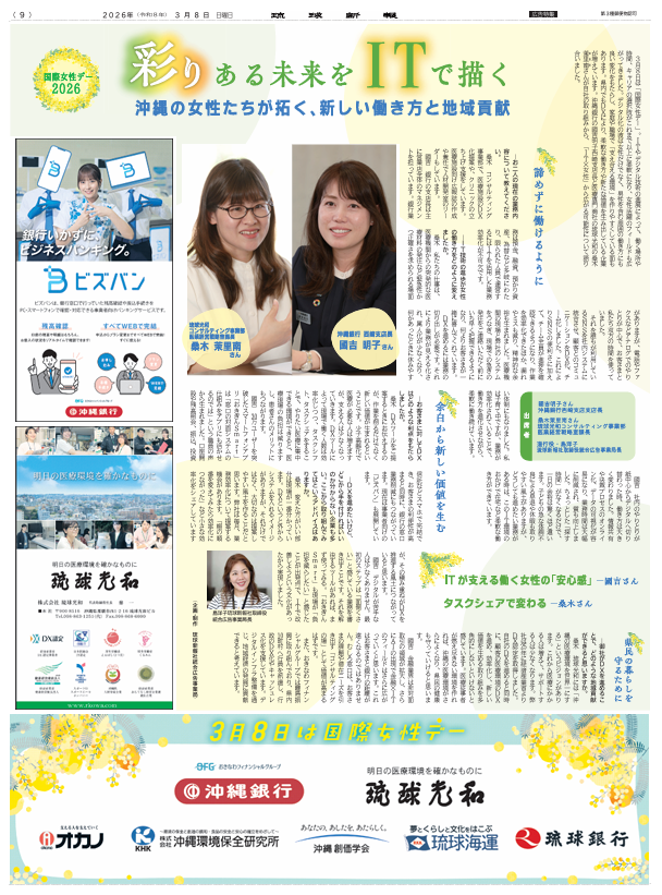 2026.03.08 お知らせ 弊社の取り組みが特集されました。 この度、弊社の取り組みが3月8日(日)琉球新報にて掲載されました。 https://ryukyushimpo.jp/pr-adv/entry-5091168.html PDF 一覧へ戻る