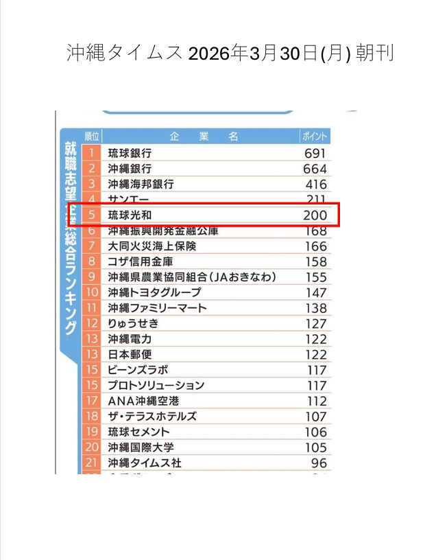 2026年度 県内就職志望企業ランキングにおいて、弊社が5位に選ばれ、沖縄タイムス(2026.3.30朝刊)において紹介されました。